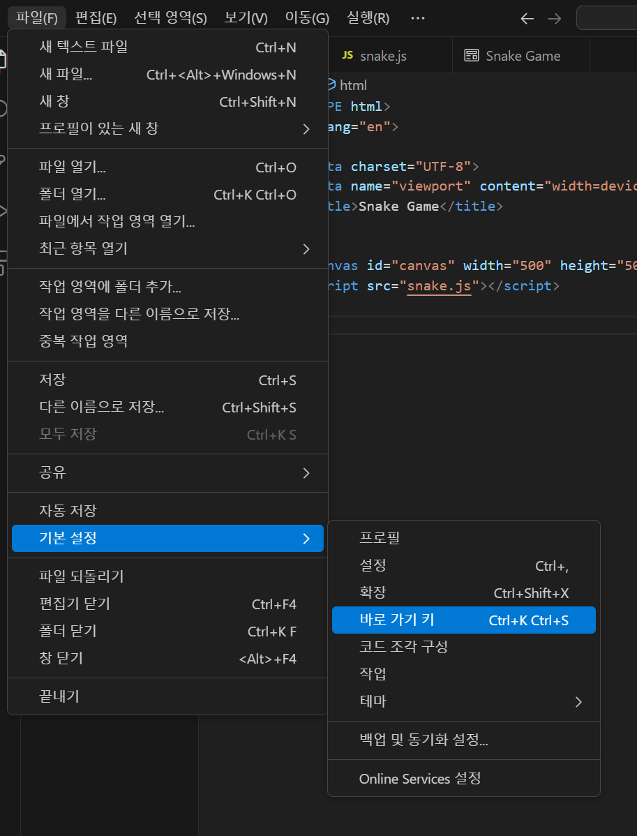 파일 -> 기본설정 -> 바로가기키 를 누른다음