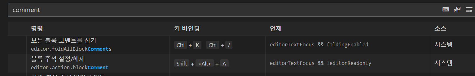comment를 치면 '블록 주석 설정/해제' 를 확인할 수 있다.